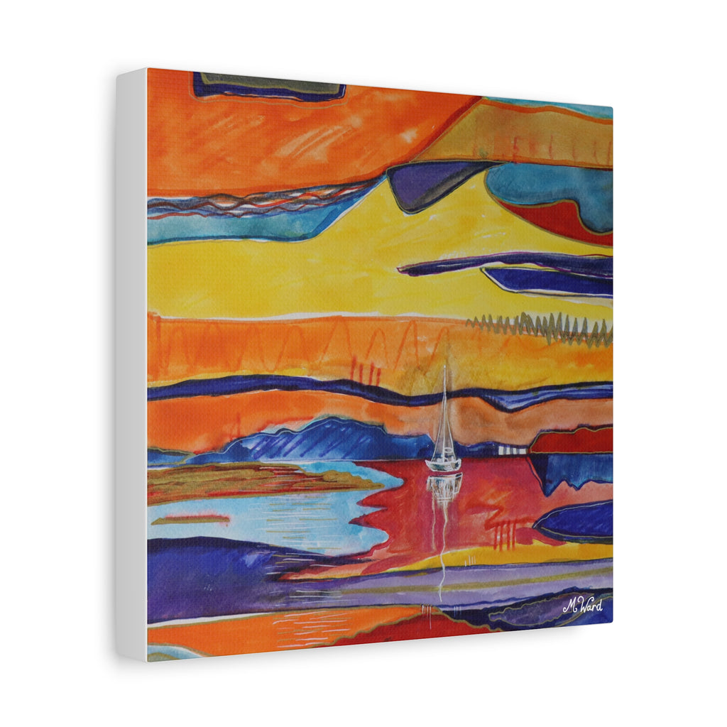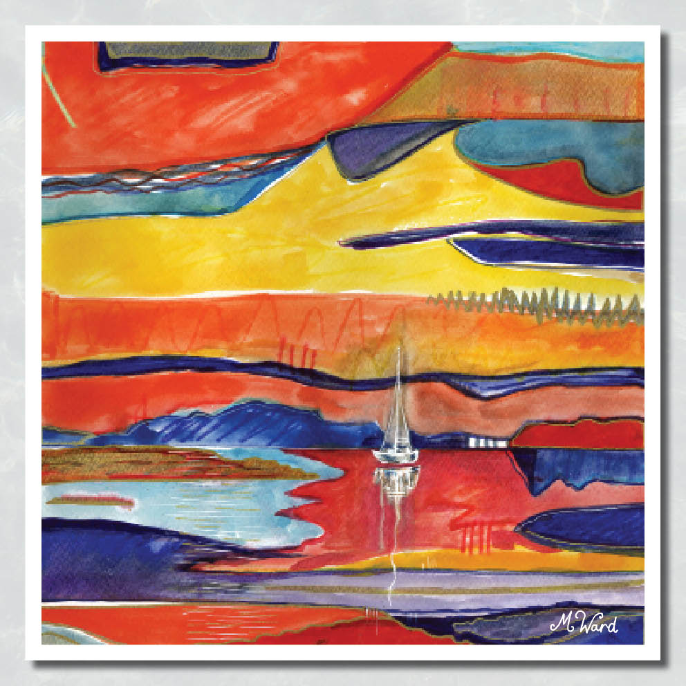 Golden Passage (2025) is a vibrant watercolour and acrylic painting featuring a lone yacht sailing through radiant washes of golden yellows, warm oranges, and soft hints of light purple. The abstract blocks of colour suggest sunlight breaking across the horizon and sea, creating movement, depth, and a sense of infinite possibility. The yacht serves as a quiet anchor amidst the luminous expanse, guiding the viewer’s eye through the dynamic yet serene composition.