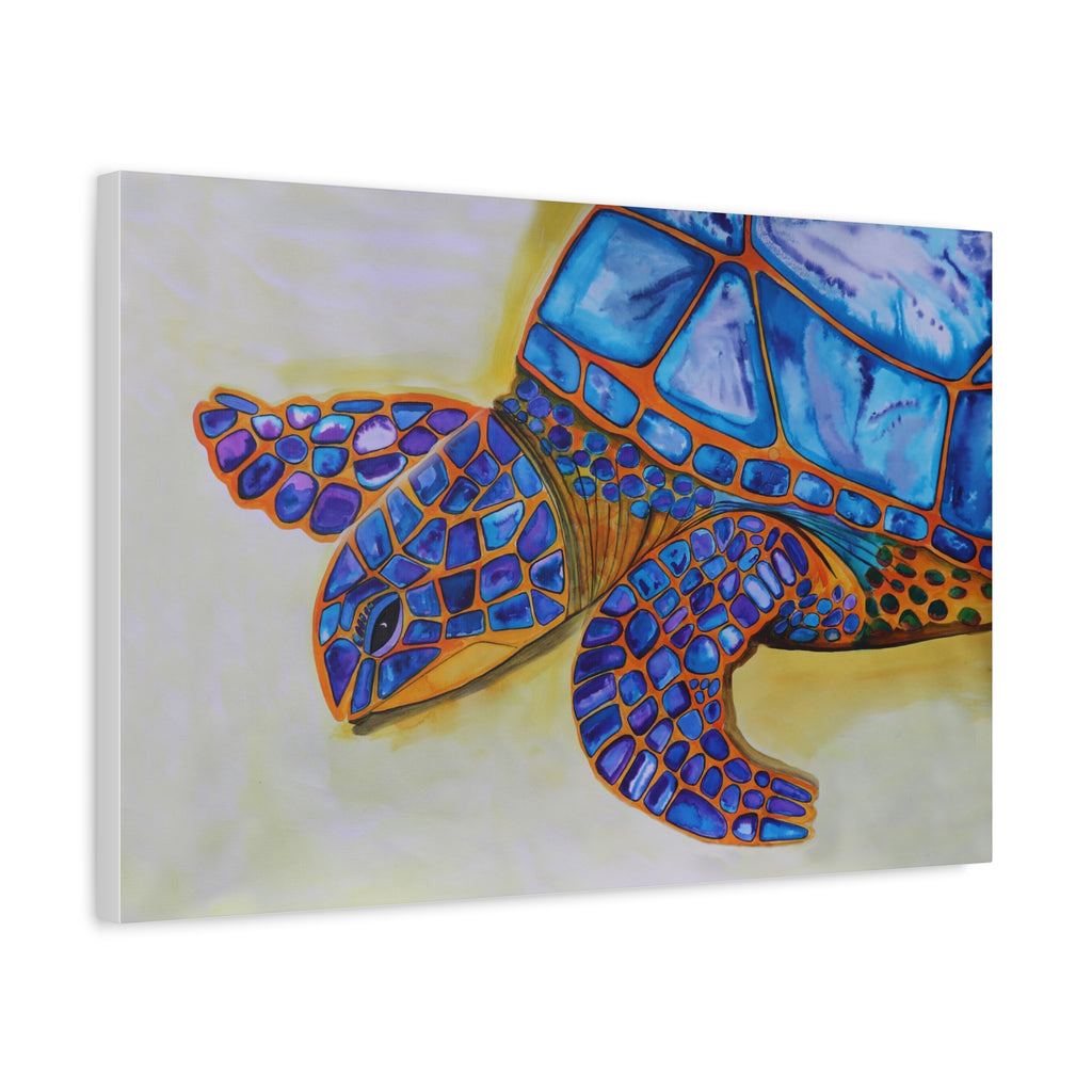 This delicate acylic ink and water colour painting depicts a serene turtle resting on the shoreline, its shell transformed into a luminous mosaic of purples and blues that shimmer like ocean jewels. The gentle meeting of sand and sea provides a peaceful backdrop, allowing the intricate shell to take centre stage as a symbol of wisdom, protection, and spiritual transformation. The harmonious blend of cool tones evokes calm, intuition, and inner clarity, while the mosaic pattern hints at the many layers of life’s journey coming together in unity. This piece invites quiet reflection, celebrating the beauty, resilience, and sacred presence of the turtle as a timeless guide of the natural world.